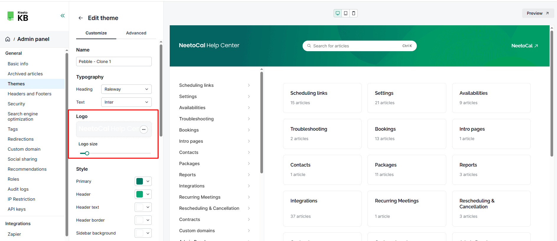NeetoKB enables you to incorporate a custom logo into your knowledge base. Having a custom logo in your knowledge base article contributes to a cohesive brand identity throughout all of your content. This same logo will be used for OG images for links previews. Follow the steps below for better clarity.